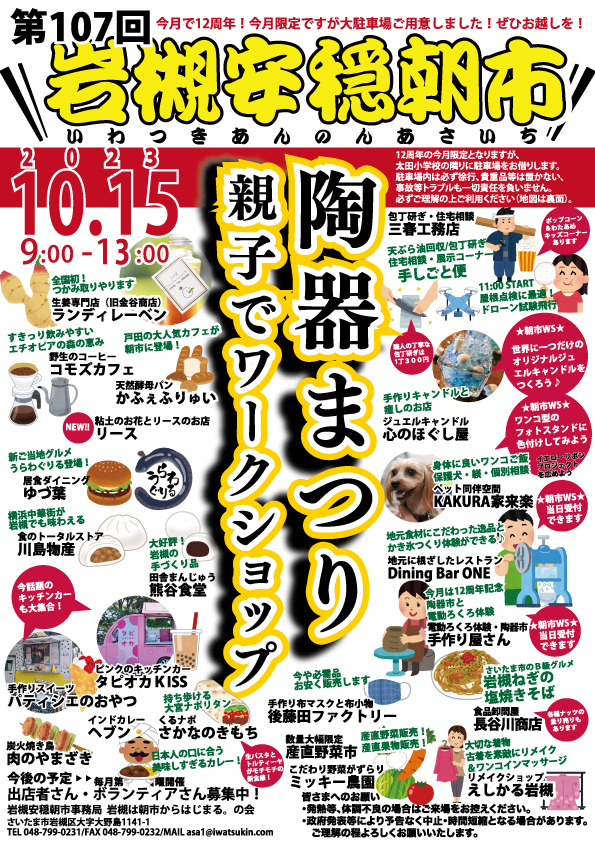 【10/15】第107回岩槻安穏朝市・今月で12周年!今月のみ大駐車場あり!〜陶器まつり・親子でワークショップ〜