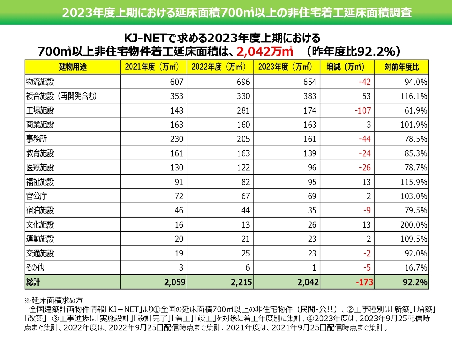 KJ-NET2023年9月配信時点での2023年度上期における延床面積700㎡以上の非住宅着工延床面積は、2,042万㎡となる。これは、昨年度の同時点(2022年9月配信時点)で比較すると173万㎡減(対前年度比92.2%)となる。
