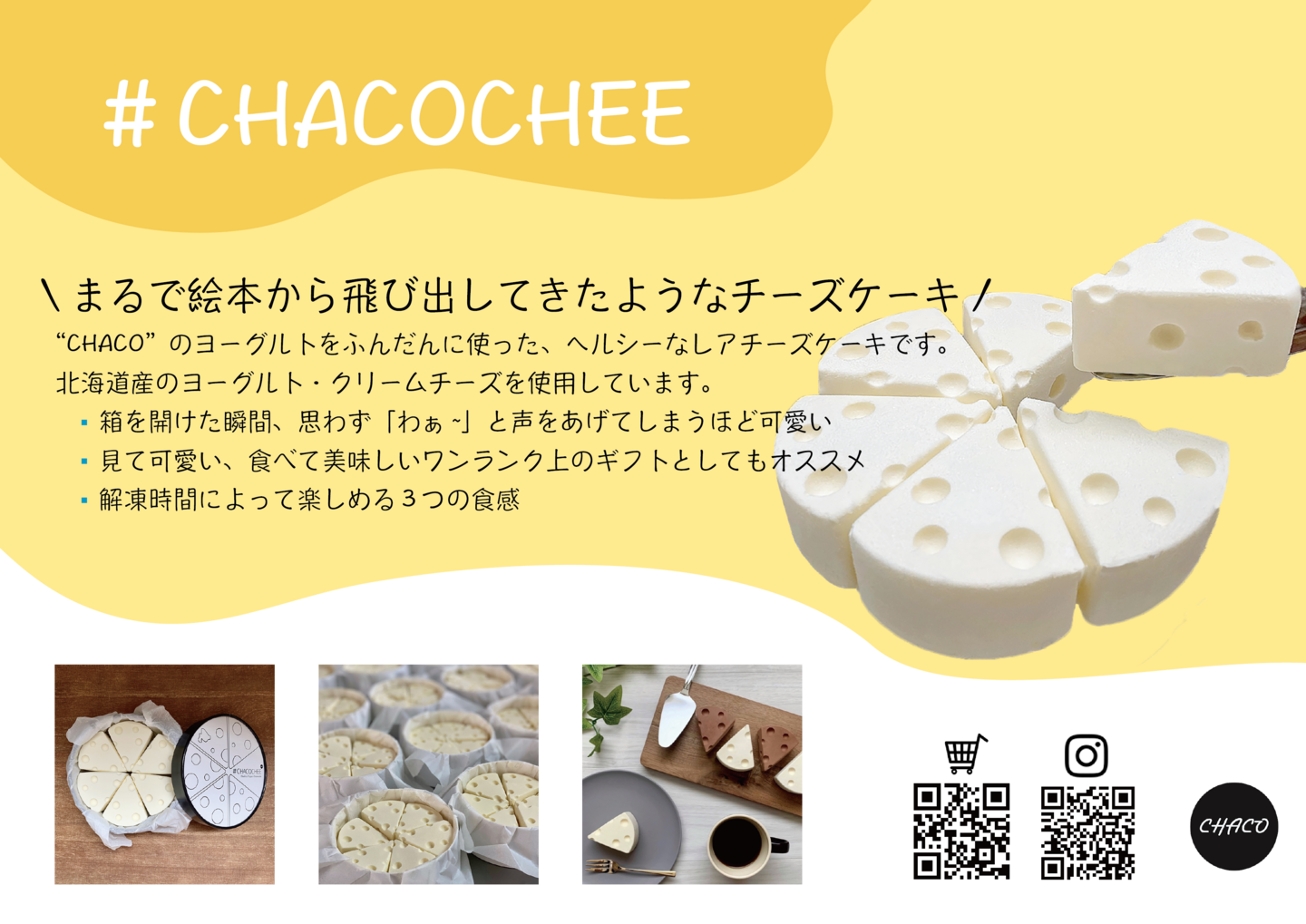 「#CHACOCHEEチーズケーキ」は昔の猫とネズミのアニメで懐かしいあのチーズをモチーフにしております。北海道生乳100%で作った濃厚な”CHACO”ヨーグルトをふんだんに使用しているので、低カロリー・高たんぱくな罪悪感のないスイーツです。大手有名百貨店でも販売された商品です。