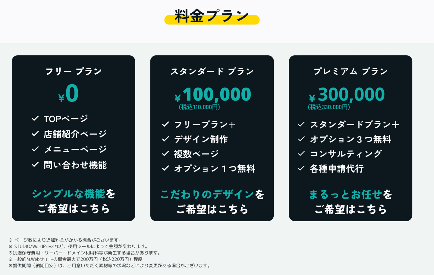 - フリープランの全機能+デザイン制作、複数ページの提供、オプション1つ無料。