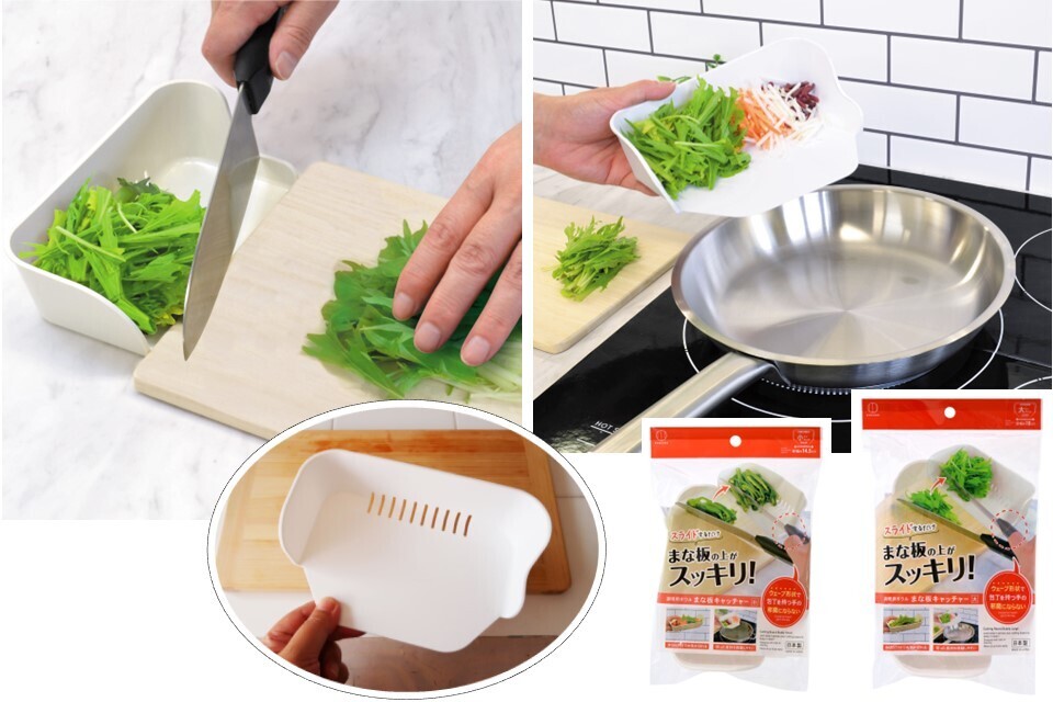 「まな板キャッチャー」新発売。切った食材をサッと移して調理しやすい。まな板の上もスッキリ!