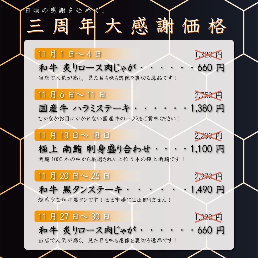 創作和食店 月。(五反田)三周年大感謝祭感謝の気持ちを込めて、高級食材メニューを特別価格でご提供。