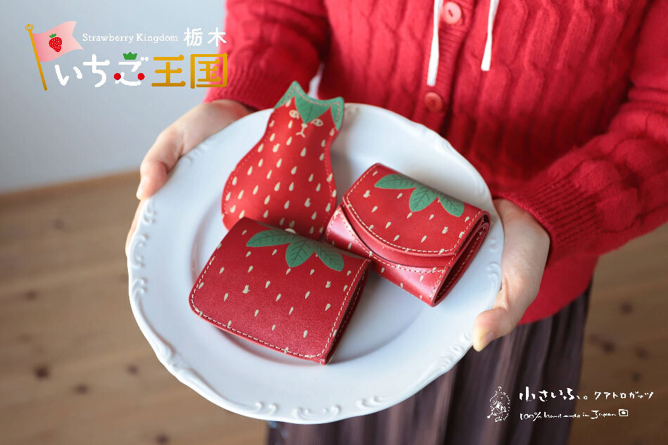 いちご王国・栃木とコラボ第3弾。いちご好きのために、栃木レザー100%でつくったミニ財布が1/15いちごの日に登場。栃木県名産”いちご”が当たるキャンペーンも。