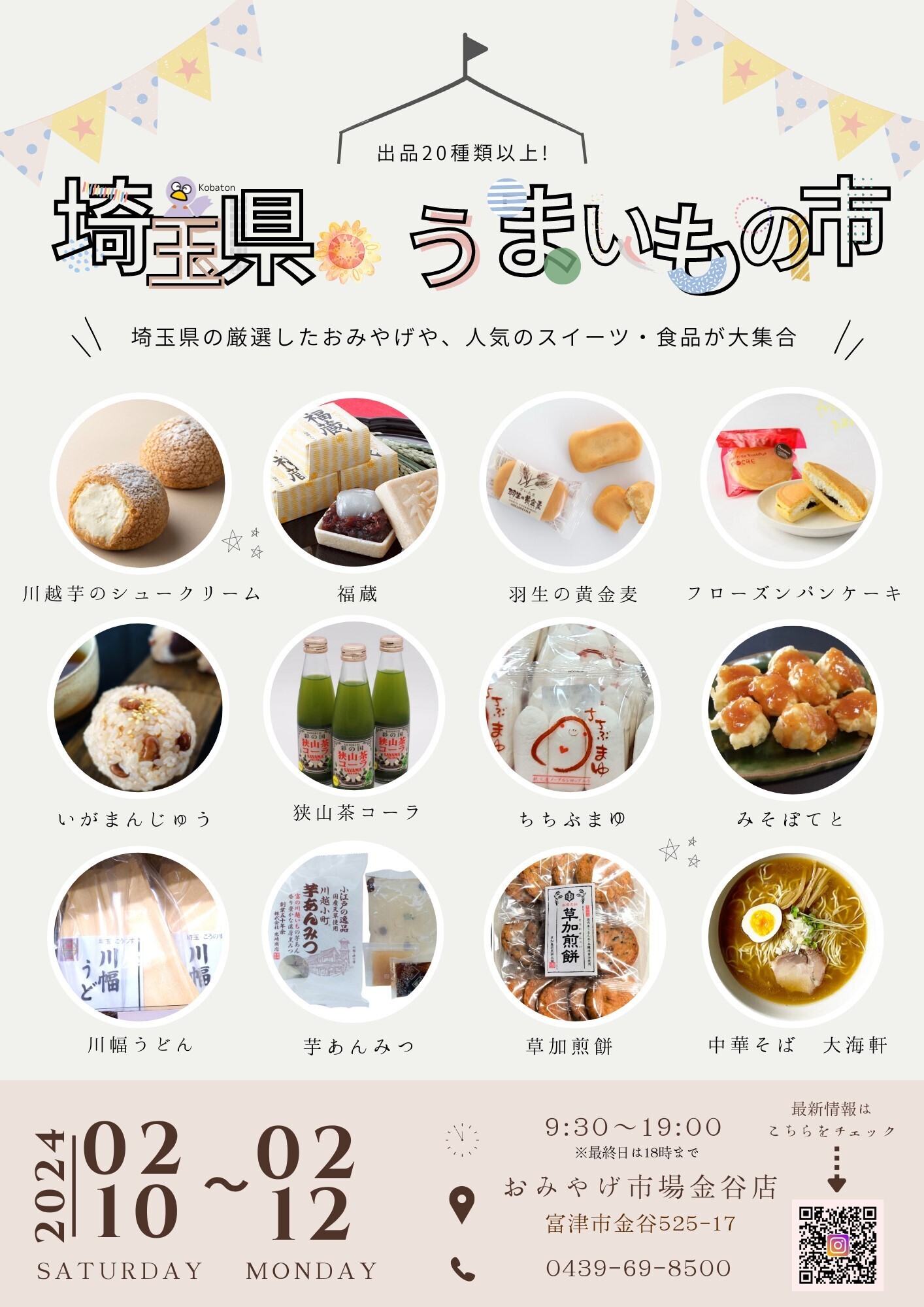 千葉県富津市のおみやげ市場金谷店では2024年2月10日から12日の3日間、埼玉県の美味しいものを集めた【埼玉県のうまいもの市】を開催することをお知らせいたします。埼玉県出身の担当者が自信をもってオススメできる美味しいものばかりです。