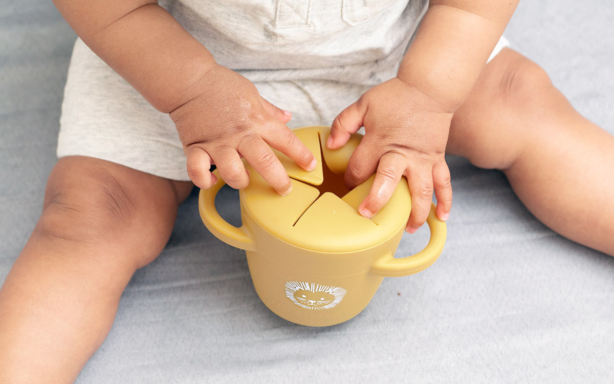 ハッピースナッカーは2つのパーツに分かれる使いやすいスナックカップです。フタの部分は固めのシリコーンでしっかりと閉めることができます。パチンと閉まる柔らかいシリコーン製の取り出し口は、小さな手を差し込んで食べ物を取り出しやすく、食べものがこぼれ出るのを防いでくれます。握りやすいハンドル設計で車のシートやベビーカーのカップホルダーにもフィットします。
