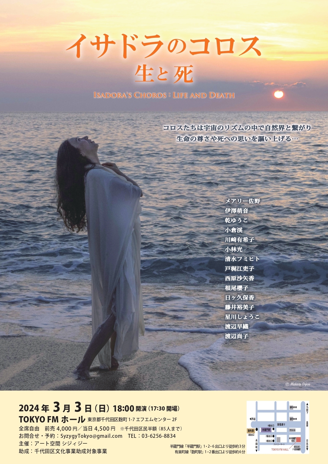 古代ギリシア劇の悲劇において観衆が苦悩や悲哀を鋭敏に感じる瞬間に現れる ”コロス゛は悲劇と観衆の間の仲介者として、観衆の震える魂に完全な調和を創る存在であった。古代ギリシアからの舞台芸術の原点を探り、現代において失われたコロスの詩的な言葉や動き、イサドラ・ダンカンが求め続けた真の舞踊を呼び覚まし、表現することに挑むシリーズの第三弾である。2020年コロナ禍で初演した「イサドラのコロス」第一弾は調和への回帰を副題とし、現代のコロスへの試みの第一歩として、真の舞踊(歌、舞踊、詩の本質的な融合)を追求、2021年の第2弾は愛と悲劇に着目し、古代の音や詩に始まり、バロックやロマン派のオペラアリアなどの愛の歌から様々な愛の形やその力を演じた。今回の第3弾公演は生と死をテーマに、生命の尊さや死への思いを17人のコロスたち(ダンサー、シンガー、アクター、ミュージシャン)が謳い上げる壮大な作品となる。