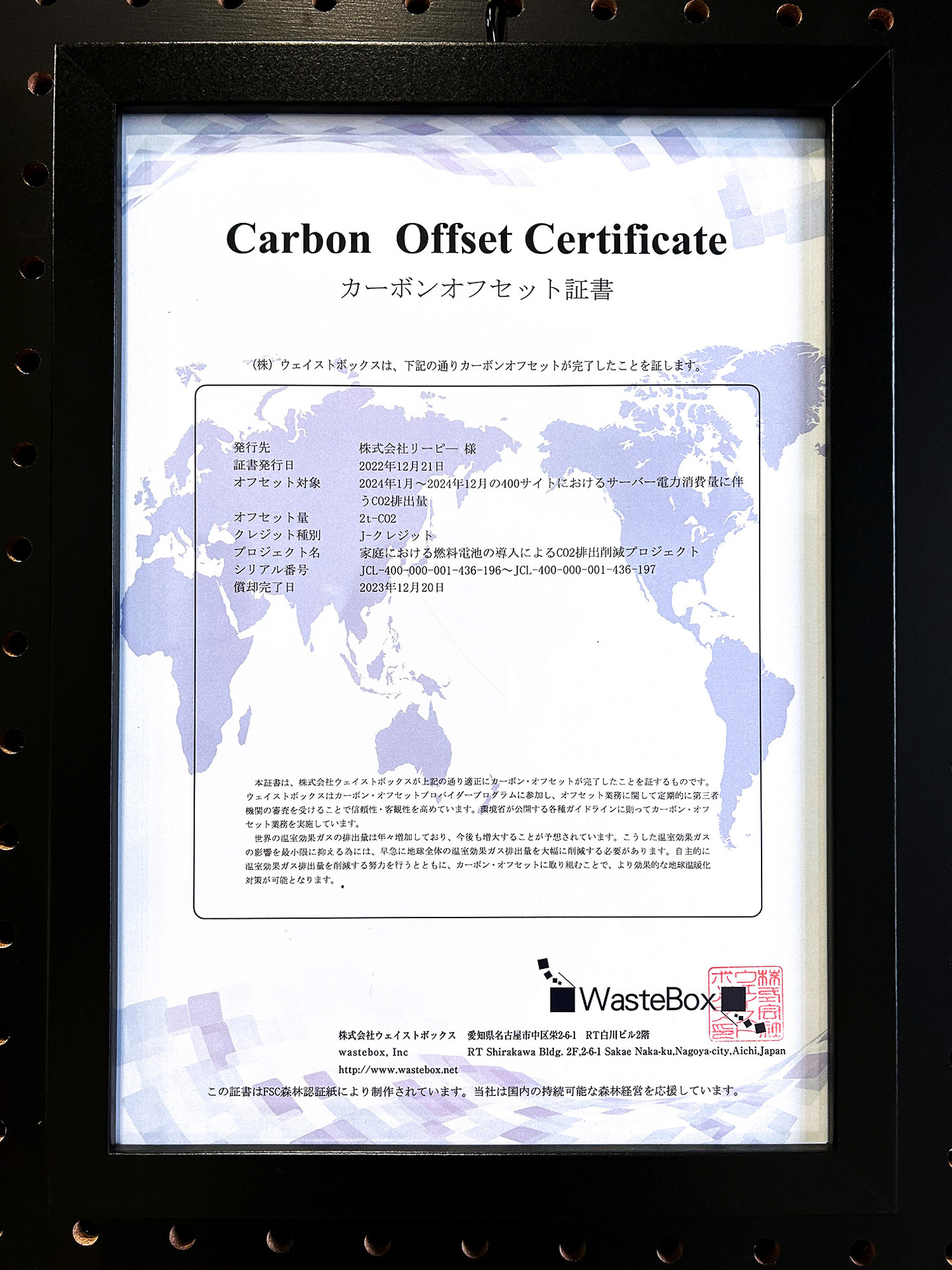 株式会社リーピー(本社:岐阜県岐阜市、代表取締役:川口聡、以下:当社)は、J-クレジットを利用し、Webサイト:400サイト分を稼働するためのサーバー電力消費量に伴うCO2排出量に対し、カーボン・オフセットを実施したことをお知らせします。