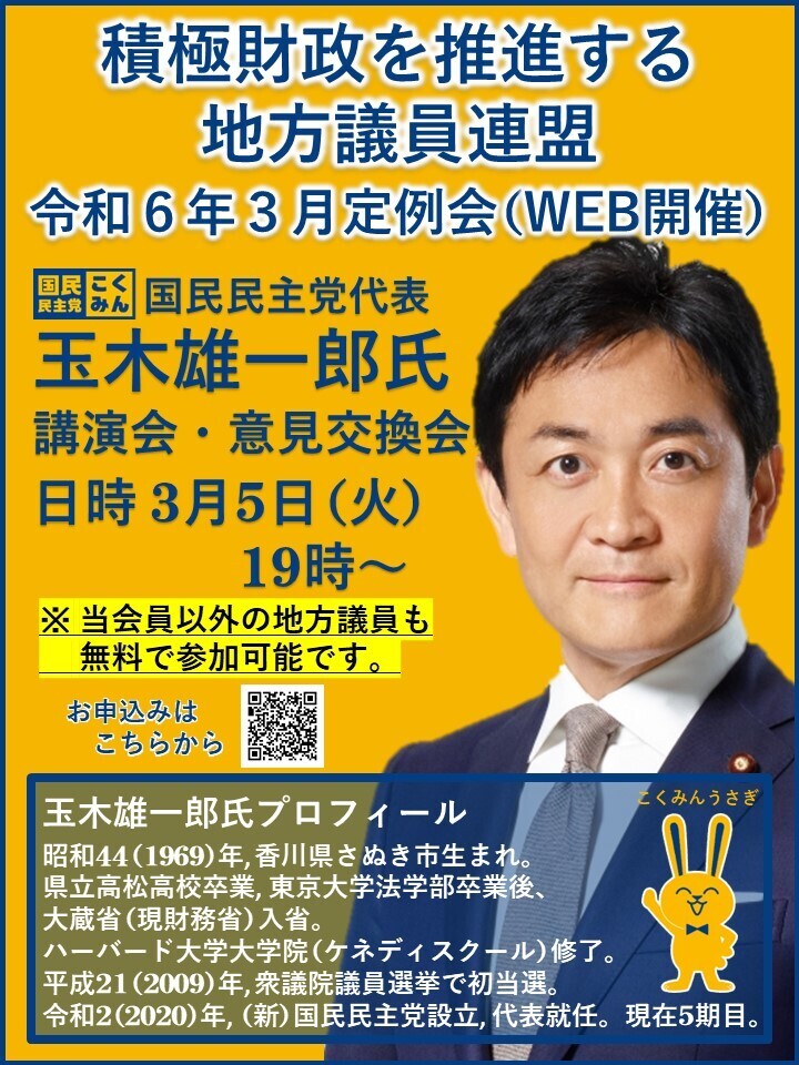 令和6年3月5日(火)19時から行われる積極財政を推進する地方議員連盟(共同代表:新潟県佐渡市議会議員 広瀬大海、会員数:141名)の3月定例会にて、ガソリン税の一部を軽減する「トリガー条項」凍結解除をはじめ、党として積極財政を訴えている、国民民主党代表の玉木雄一郎衆議院議員の講演会・意見交換会をオンラインにて開催致します。