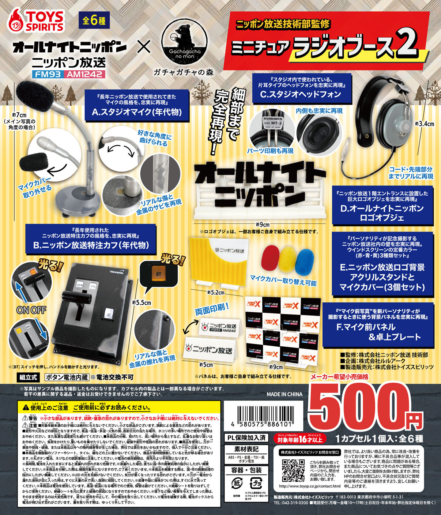 今回は、実物の使用感をより忠実に再現した「ニッポン放送技術部監修ミニチュアラジオブース2」(発売元:株式会社トイズスピリッツ)、レトロなデザインが魅力の「オールナイトニッポン×ガチャガチャの森 コラボアクリルキーホルダー」(発売元:株式会社ブライトリンク)、オールナイトニッポンのロゴなどをモチーフにした「オールナイトニッポン缶バッジ」(発売元:株式会社エール)や、前回の「コラボレート・ニッポン」内企画「あなたの希望が実現!ガチャの森アイデア会議」(2023年4月)で寄せられた、「痛み」や「傷」をポジティブにしたいというリスナーからの想いを商品化した、「オールナイトニッポン×ガチャガチャの森 コラボ絆創膏」(発売元:株式会社J・ドリーム)の4商品が発売される。