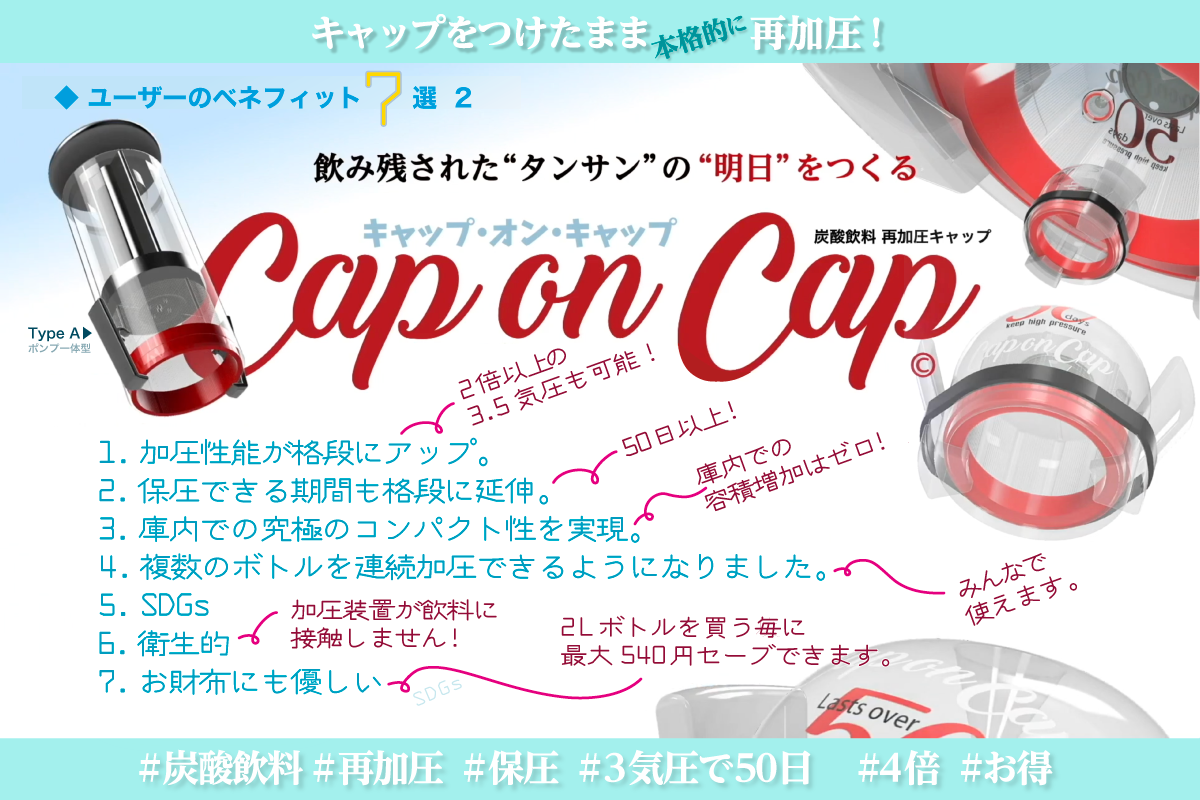 炭酸飲料が余ったらボトルCapの上から本製品をかぶせ再加圧する「Cap on Cap」。“再加圧・保圧ギア”にまったく新しいMeansの登場です。【Cap on Capがご提供できる利点7選】 ❶「高い再加圧性能」従来1.2気圧が限界と言われていた同価格帯の加圧性能が約3倍に▶︎開栓前と同等の3.5気圧まで可能になりました。 ❷「高い気密性能」ボトルに最適化されたキャップをそのまま継続使用できるので50日以上減圧しない高気密性を実現しています。 ❸「究極のコンパクト性」保存時にボトルから分離可能なので容積の増加は一切ありません。 ❹同じく「高い機動性」ボトルから分離可能なので1個で複数のボトルを加圧保存できます。 ❺SDGs ❻「高い衛生性」構造上、加圧装置と飲料が接触しません。 そして一番大切な❼「高い経済性」2Lボトルを買う毎に他のボトルを買うより最大540円の支出をセーブできます。
