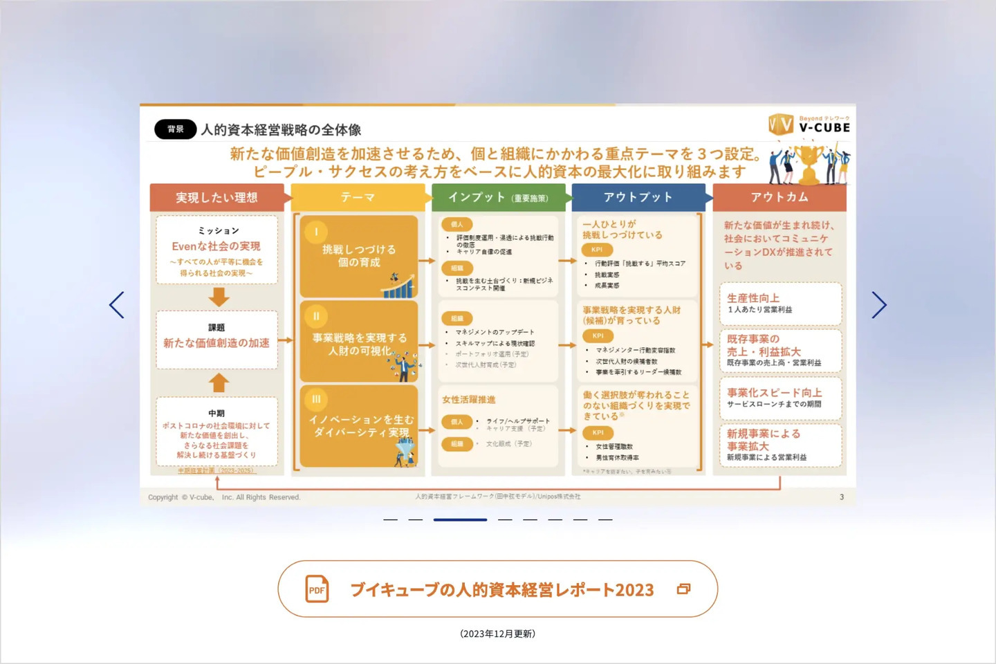 『人的資本経営に関する情報開示』ページでは同社の人的資本経営の戦略と人材データを、簡潔かつ視覚的に表現しています。また、設計から制作までご支援した『ブイキューブの人的資本経営レポート2023』も同ページに掲載。戦略の全体像、具体施策、⼈的資本に関する指標を8ページの資料にまとめています。