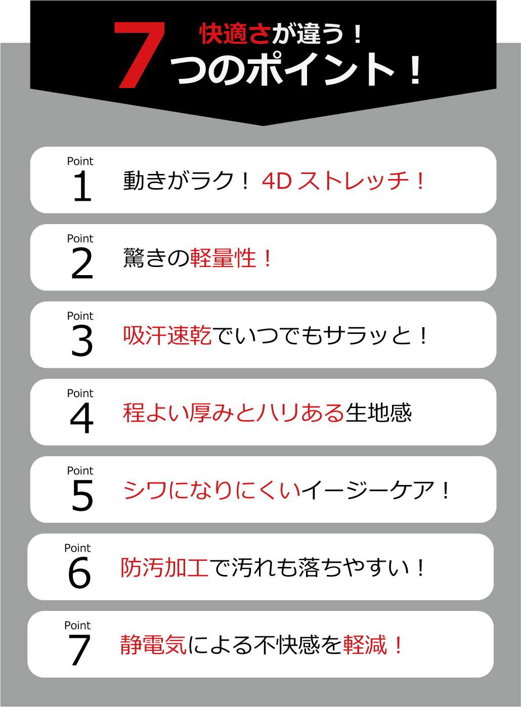 ・機能 :4Dストレッチ・軽量・吸汗速乾・防汚機能・帯電防止