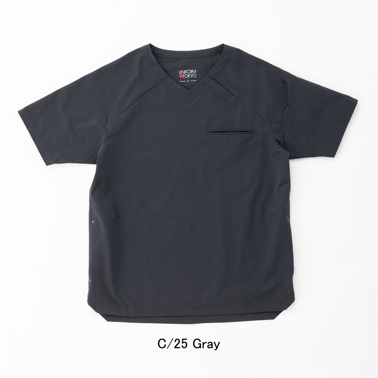 生地は全方向に伸びる4Dストレッチ素材を使用。身体の動きに沿ってフィットし、着用時のストレスを大幅に軽減したスクラブ白衣。