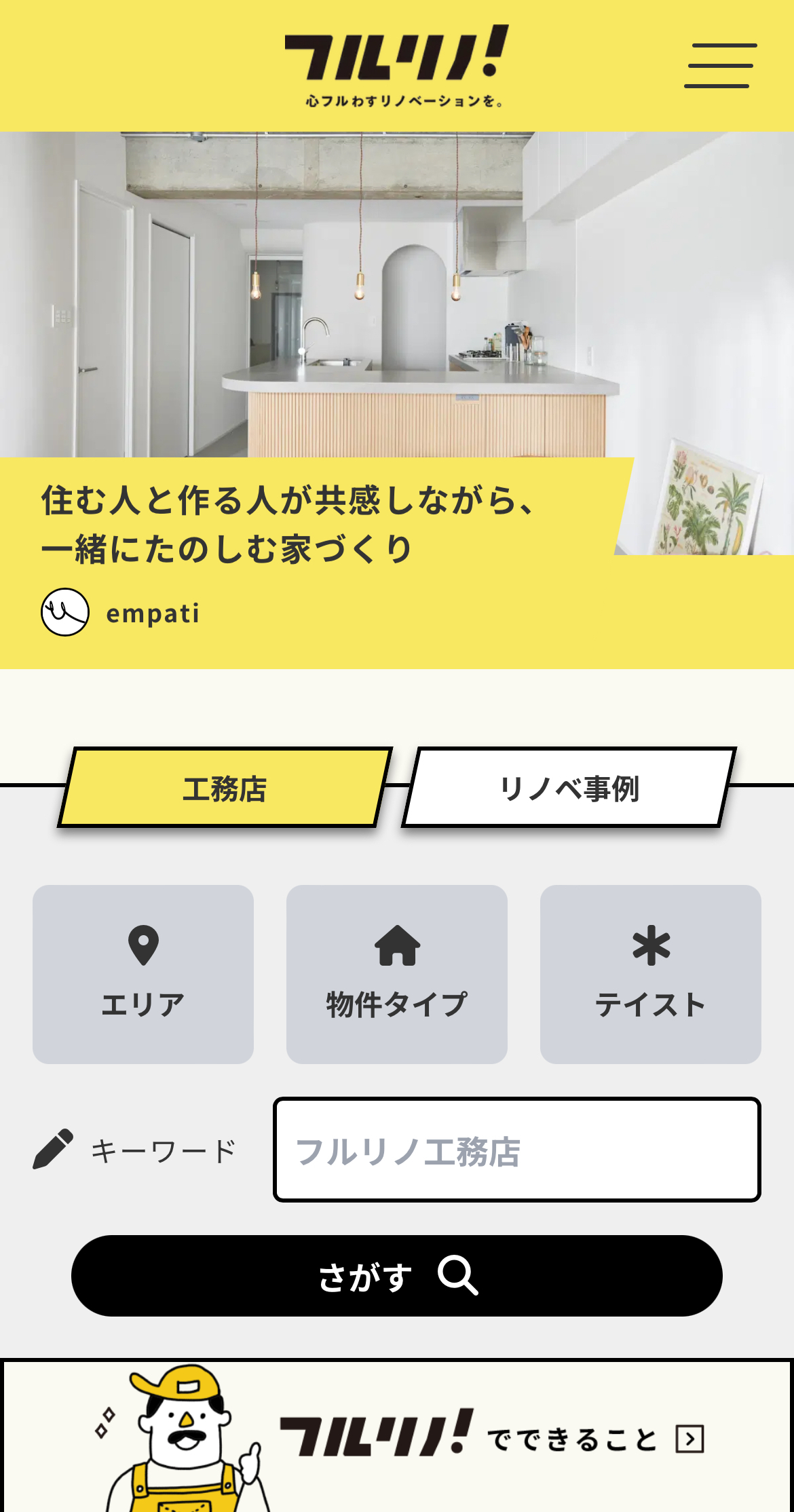 「フルリノ!」は、日本に数あるリノベーション事業者の中から、特に高品質で優良な事業者の情報を集約したポータルサイトです。その中から、リノベーションをしたい人が自由に工務店を探し、依頼や問い合わせをすることができます。