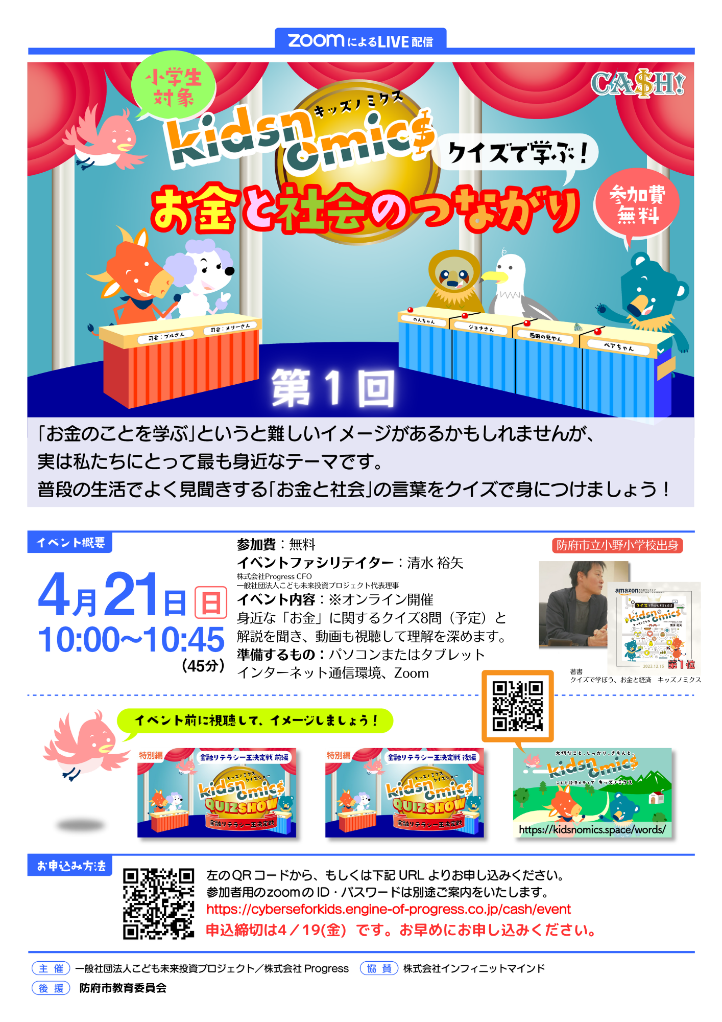 一般社団法人こども未来投資プロジェクト(福岡市: 代表理事 清水裕矢)と株式会社Progress(福岡市: 代表取締役CEO 秦 有樹)は、防府市内の17小学校、11中学校に書籍「クイズで学ぼう、お金と経済 キッズノミクス」を寄贈いたしました。また、2024年4月21日(日)には防府市教育委員会さま後援にて、小学生対象「クイズで学ぶ!お金と社会のつながり」と題した無料オンラインイベントを実施する運びとなりました。一般社団法人こども未来投資プロジェクト/株式会社Progressはこどもの金融リテラシー向上への貢献を目指します。
