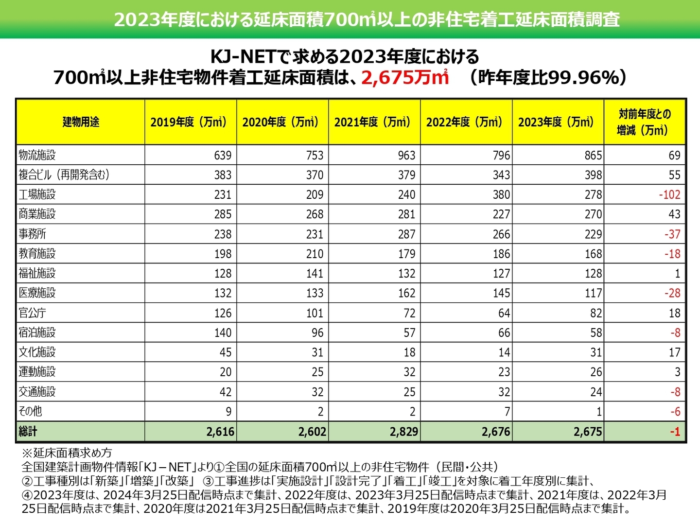KJ-NET2024年3月配信時点での2023年度における延床面積700㎡以上の非住宅着工延床面積は、2,675万㎡となる。これは、昨年度の同時点(2023年3月配信時点)で比較すると1万㎡減(対前年度比99.96%)となる。