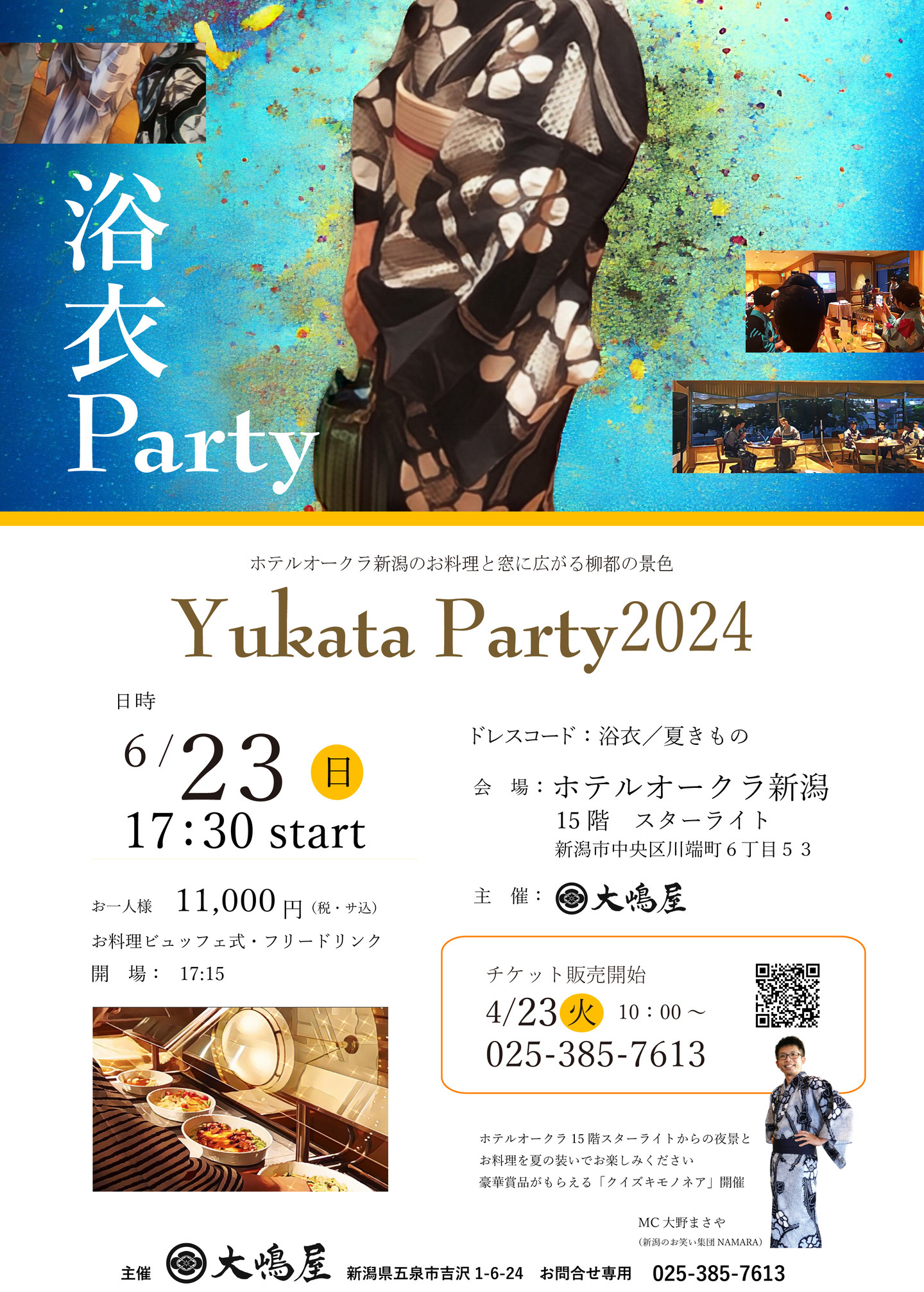 有限会社大嶋屋呉服店(本社:新潟県五泉市)(以下、大嶋屋)は、ホテルオークラ新潟にて、6月23日日曜日に「YUKATA PARTY(ゆかたパーティー)」を開催。大嶋屋は「日本の美しいでみんなをHAPPYに。」を企業理念に、日本の美を楽しむ機会を提供する企画運営を行う。アトラクション「クイズキモノネア」は幅広い年代が楽しめる内容。ホテルオークラ新潟の料理はビュッフェ形式で、フリードリンク付、15階Starlightからは新潟の夜景を楽しむことができます。チケットは専用電話番号025-385-7613 またはネットショップ【大嶋屋】で4月23日より発売開始。主催は大嶋屋呉服店・着物ライフスタイルサロン大嶋屋。お問い合わせとチケット購入詳細はhttps://oshimayayukatashop.stores.jp/items/66151592eb6dbe02c6332196