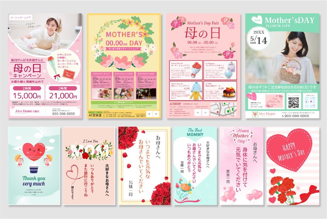 デザインACでは、母の日を彩るクオリティの高いポスター、チラシ、プライスカード、SNS用バナー画像等の集客に役立つテンプレートをお届けします。その他にもプレゼントに添えるおしゃれで可愛いメッセージカードのテンプレートも豊富にご用意しています。