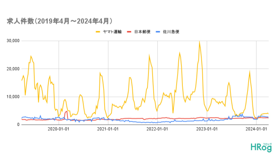 物流大手3社の求人件数を見てみると、ヤマト運輸ではお中元やお歳暮の時期となる7月と11月頃だけ求人数を増やしており、季節性が強い様子が伺えます。2024年4月時点では、ヤマト運輸が3,827件で最多。佐川急便が2,658件、日本郵便が2,369件と続きました。