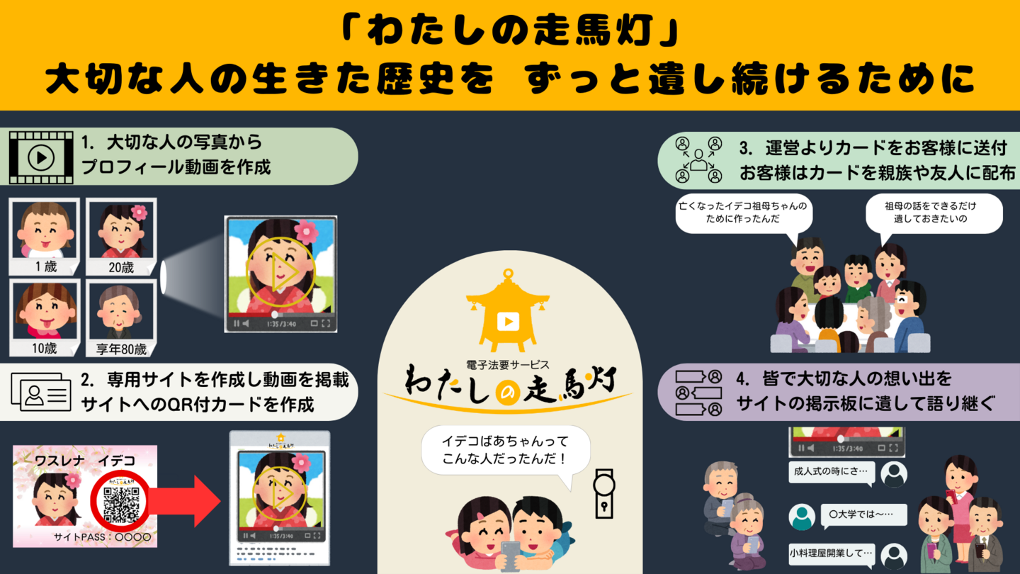 上記の死生観を元に、大切な人が生きてきた証を消さないために想い出を語り継いでいくスキームを提供するサービスです。