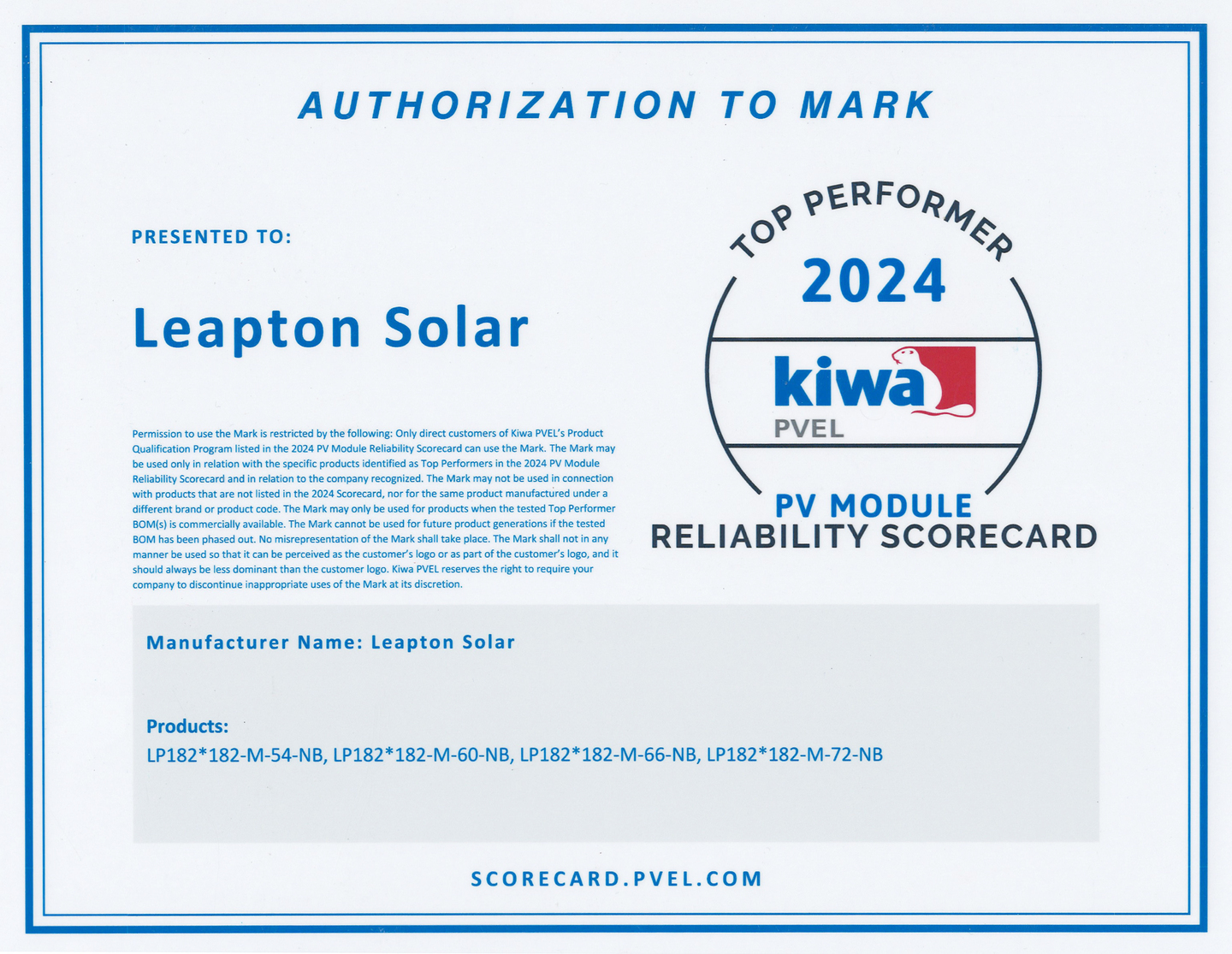 リープトンエナジー株式会社(代表取締役:周 鳴飛、本社:兵庫県神戸市)は、 PVEL (Photovoltaic Evolution Labs) の厳格なテストを経て、PVモジュール信頼性スコアカードの2024年度版にて「トップパフォーマー」の認定を受けたことをお知らせいたします。これにより、太陽電池モジュール製造における当社の品質管理、製品の信頼性、顧客満足度における卓越性が証明されました。