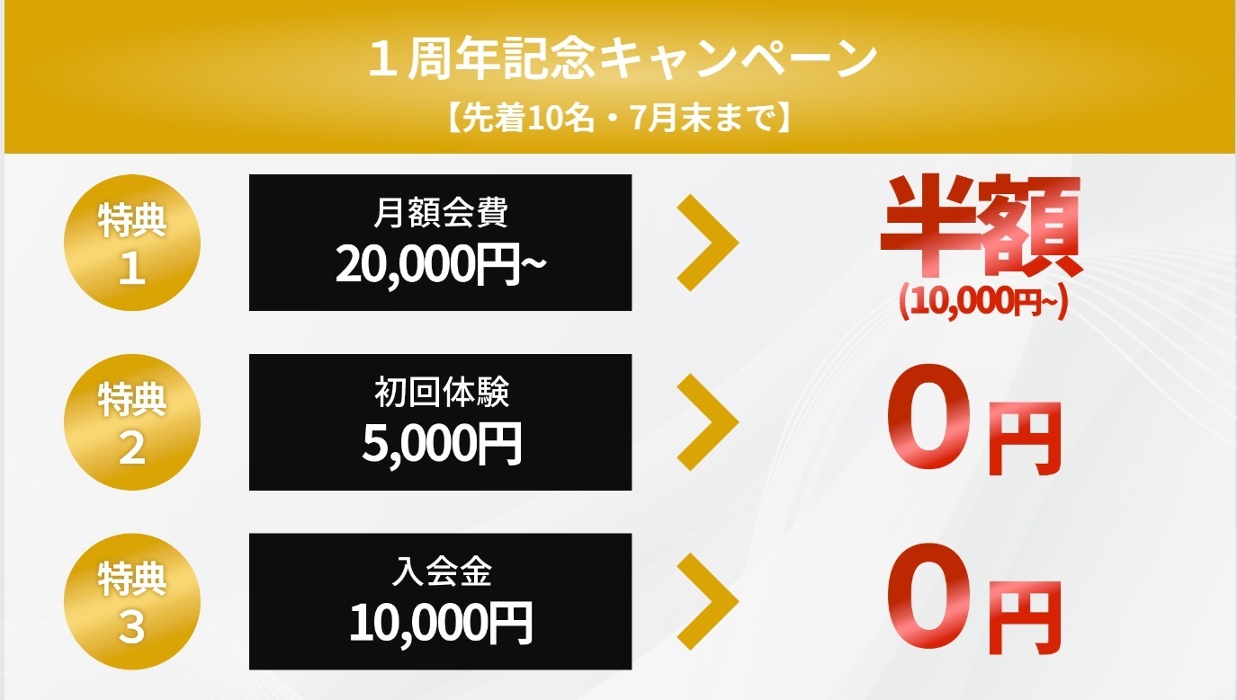 当ジム開業1周年を記念して特別なキャンペーンを開催。『全コースの月額会費50%オフ』『初回体験0円』『入会金0円』の7月末まで先着10名様の限定オファーです。高品質なパーソナルトレーニングを1回2000円~のお得な価格でご提供します!