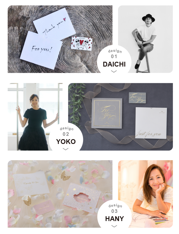 ウエディング業界のみならず、多方面で活躍している有名デザイナー3名がプロデュースした限定カードは、結婚式らしさが伝わるデザインです。