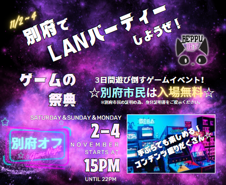ゲームイベントの企画をしているJust 4 Design(拠点:大分県 代表:門脇祐二)は、別府市制100周年記念として、2024年11月2日(土)・3日(日)・4日(月)の3日間でLANパーティーイベントを開催します。