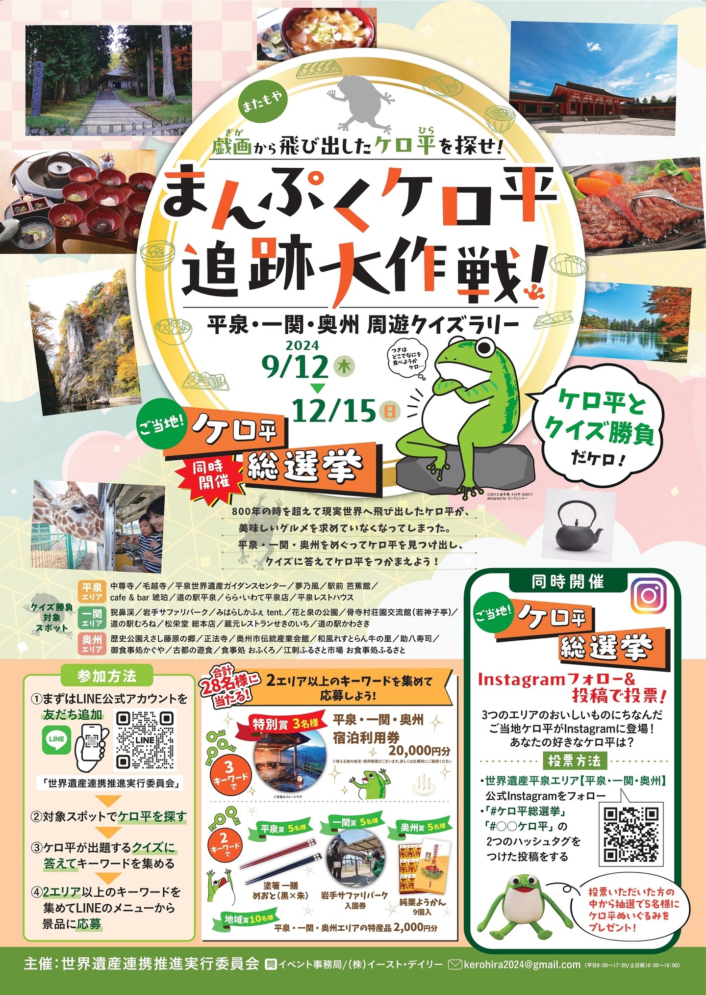 ・平泉町、一関市、奥州市の食べ物にちなんだ「ご当地ケロ平」に対して、指定のハッシュタグをつけてInstagramに投稿し、どのケロ平が人気かを競います。投票者の方には抽選で5名様にケロ平のぬいぐるみをプレゼントします。