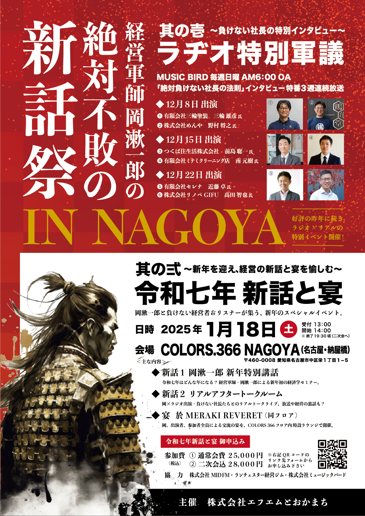 ラジオ番組「経営軍師 岡漱一郎の絶対負けない!社長の法則」が、「経営軍師 岡漱一郎の 絶対不敗の新話祭 in NAGOYA」と題し特別イベントを開催します!