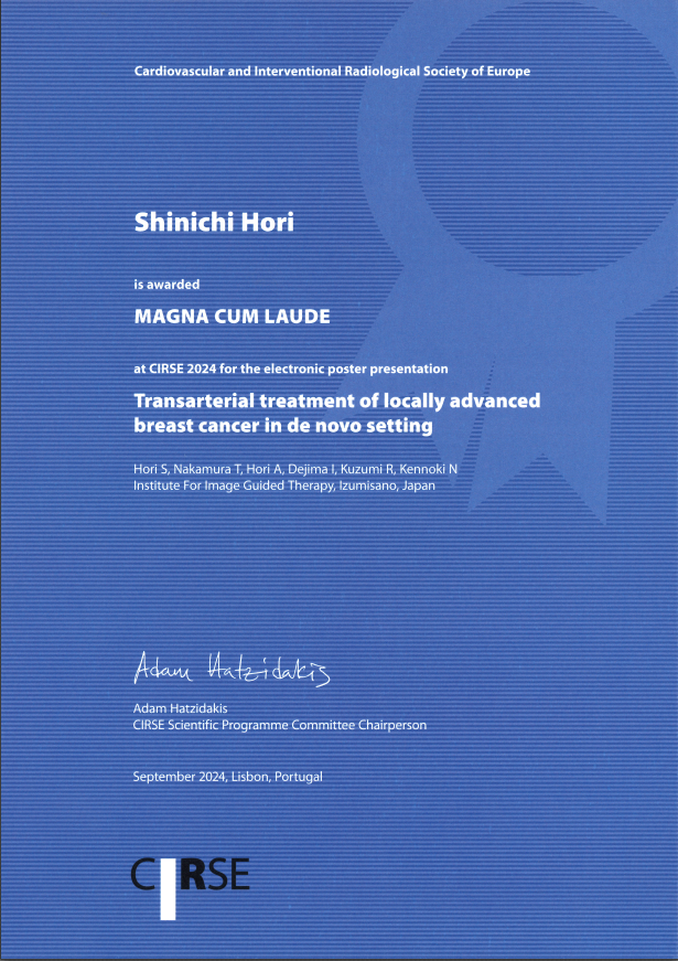 今回の学会では、876人の学術論文およびポスター発表者がいる中、堀 信一先生が発表したポスターが5つも採択され、その中の「Transarterial treatment of locally advanced breast cancer in de novo setting」が本年度のMagna Cum Laude Poster Awardを受賞しました。