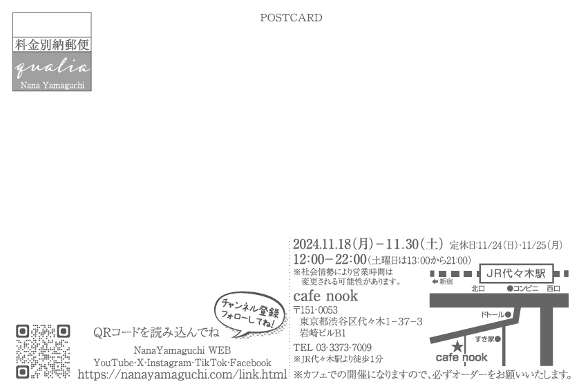 アーティスト山口奈々は、2024年11月18日(月)~2024年11月30日(土)の期間中、cafe nook(東京都渋谷区代々木)にて個展「qualia」を開催いたします。