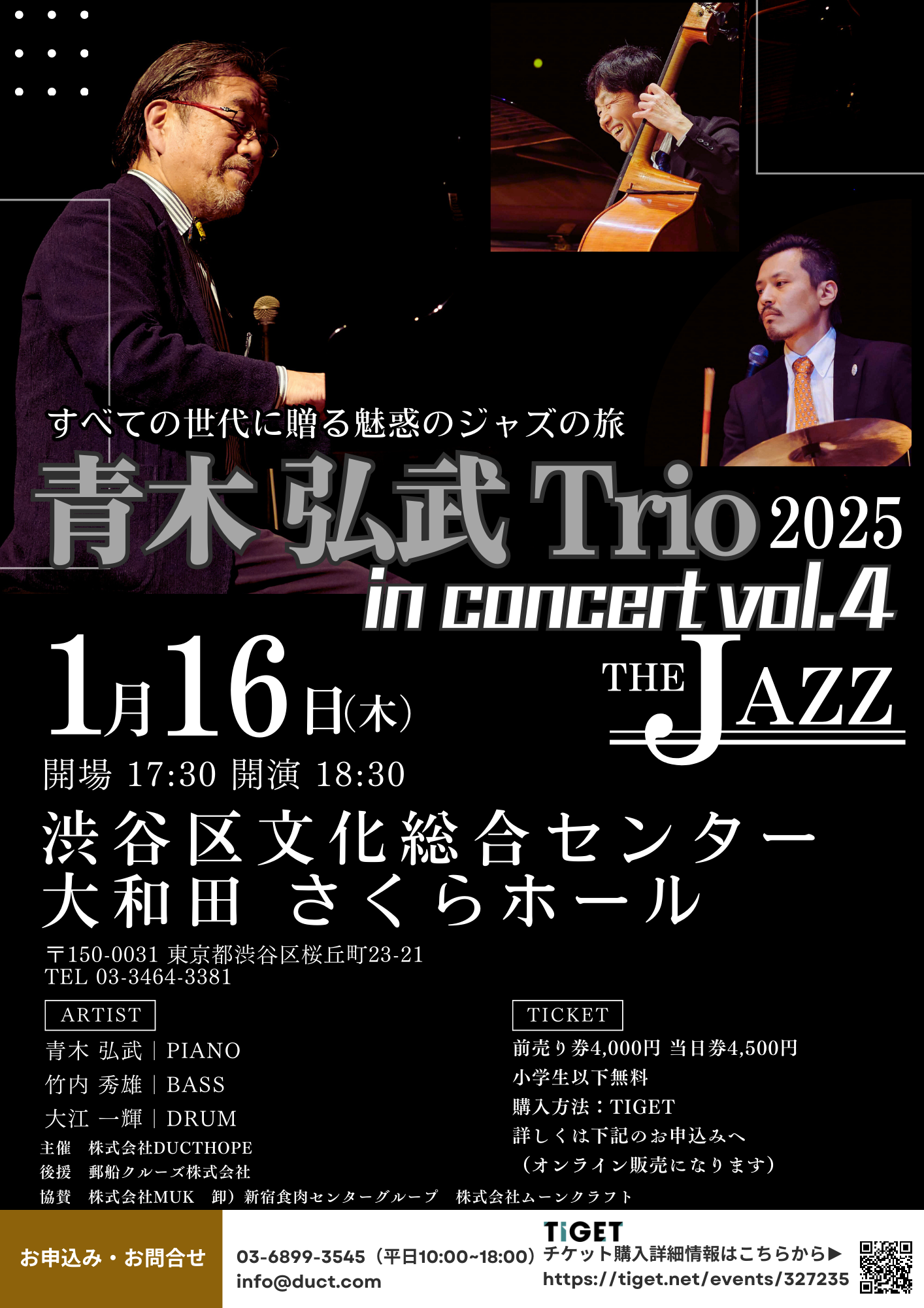 このたび、2025年1月16日(木)に渋谷区文化総合センター大和田 さくらホールにて、「青木弘武Trio in concert Vol.4」を開催する運びとなりました。本公演では、ジャズピアニスト青木弘武を中心としたトリオによる至高の音楽をお届けする予定です。つきましては、本公演を多くの方々に知っていただきたく、貴媒体への広告掲載をご検討いただけますと幸いです。
