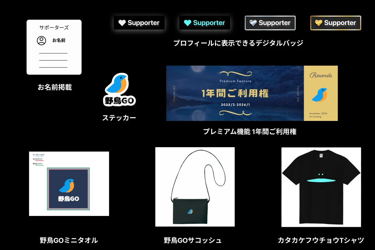 クラウドファンディングサイトCAMPFIREにて All-in 形式にて実施。目標金額は300万円。クラウドファンディングのリターンとして限定のオリジナルTシャツやサコッシュ、自分で撮影した野鳥写真で作るオリジナルのリアル野鳥図鑑などのグッズ販売とともに、野鳥GOアプリで使用できるデジタルサポーターバッジ、プレミアム機能の割引利用権などを販売。