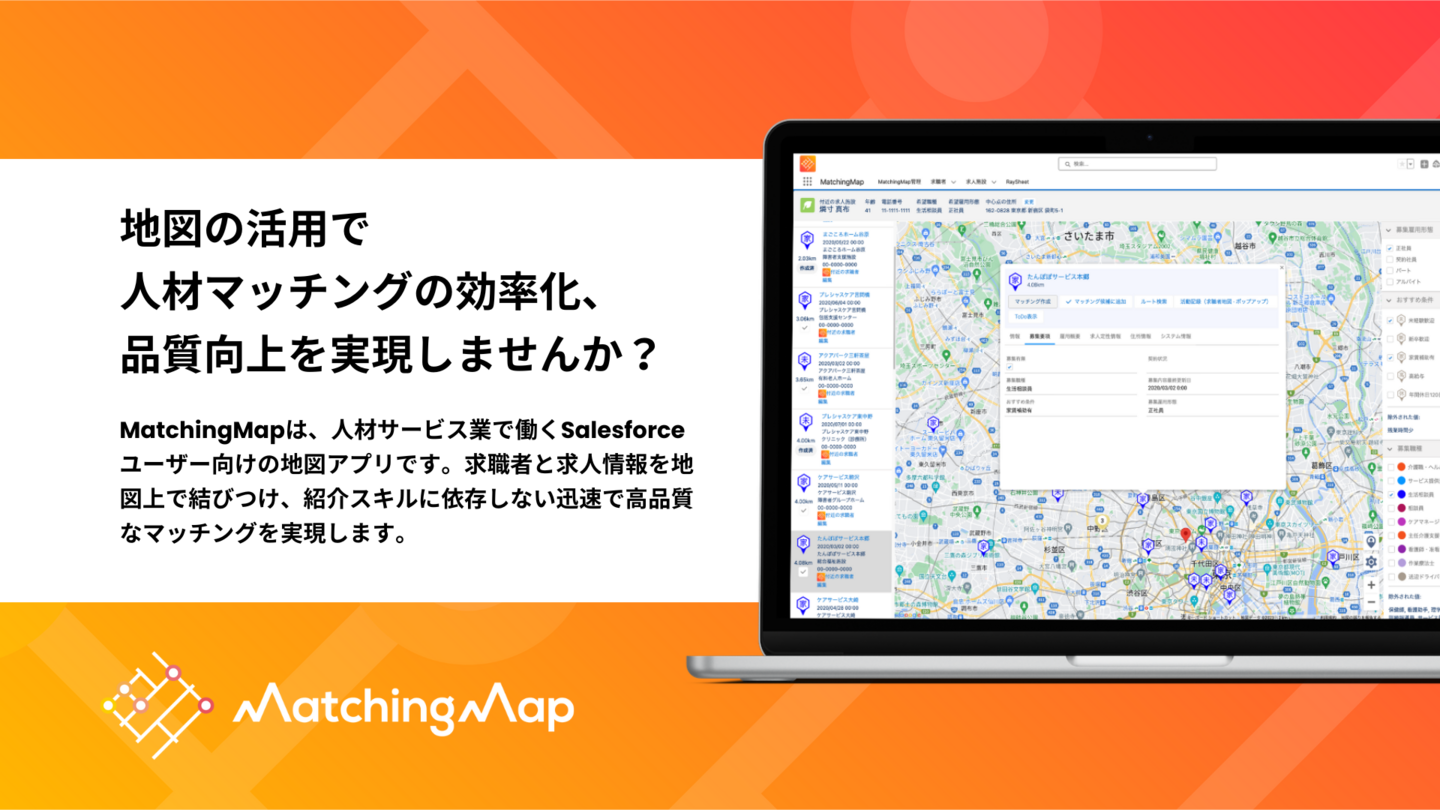 MatchingMap(マッチングマップ)は、SalesforceのSales Cloudを拡張する人材サービス業向け地図アプリケーションです。地図を活用したデータの可視化により、効率的な求人情報の検索とマッチングを実現します。 https://matchingmap.co-meeting.co.jp