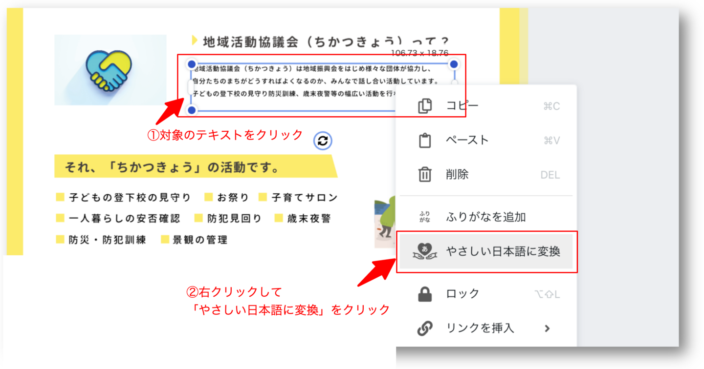 「やさしい日本語」機能は、対象となる文章を選択して右クリック、「やさしい日本語に変換」を選択するだけで瞬時にわかりやすい日本語に変換、漢字にはふりがなが追加される機能です。