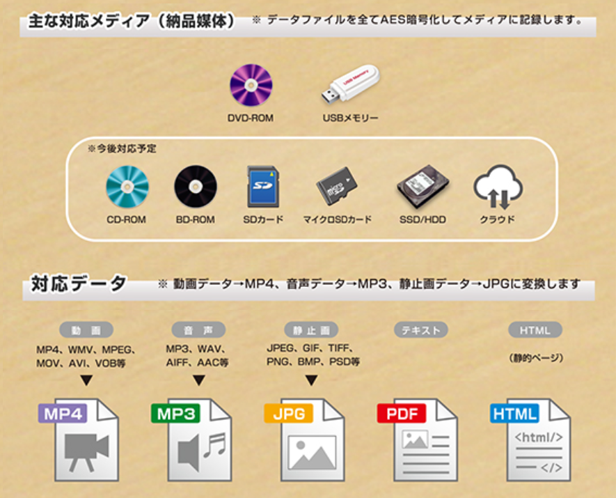 多様な記録媒体への対応:DVDやUSBメモリといった物理媒体だけでなく、クラウドストレージや将来的な新しいデバイスへの対応を通じて、幅広い利用シーンに対応可能なソリューションを提供します。