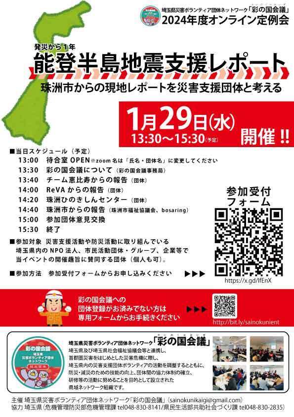 埼玉県及び埼玉県社会福祉協議会等と連携し、首都圏災害をはじめとした災害危機に際し、埼玉県内の災害支援団体ボランティアの活動を調整するとともに、防災・減災のための技能の向上、団体間の協力体制の確立、研修等の活動に努めることを目的に活動している埼玉県災害ボランティア団体ネットワーク「彩の国会議(読み:さいのくにかいぎ)」は、2024年1月1日に発災した能登半島地震から1年の経過を機に、2025年1月29日(水)13:30-15:30の日程でオンライン定例会を開催します。