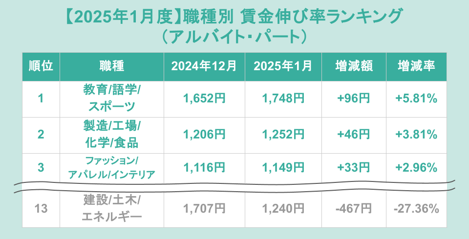 主要9媒体から雇用形態別に分析!アルバイト・パートでは教育系が前月比+5.81%で1位【2025年1月度 職種別 賃金伸び率ランキング】