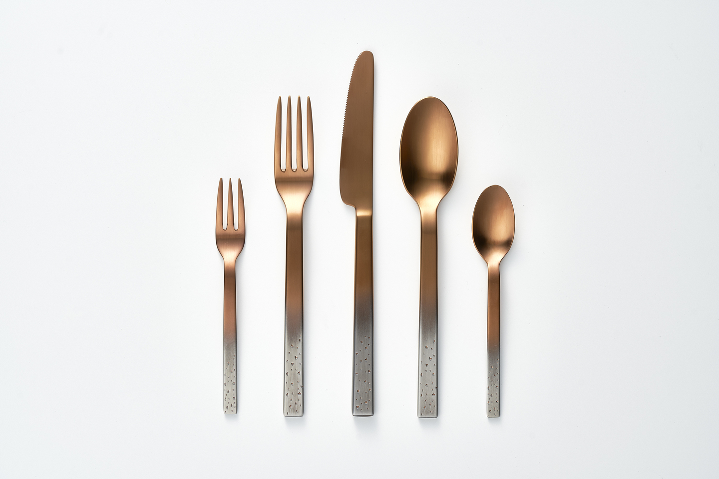 職人の手技が模様として浮かび上がる仕上げを開発。「磨く」「削る」「剥ぐ」という研磨技術を駆使し、一本ごとに異なる表情を生み出しました。特に「剥ぐ」技法は金属洋食器業界では前例がなく、繊細なコントロールが求められる部分的な色残しは、機械では決して再現できない手磨きならではの技です。