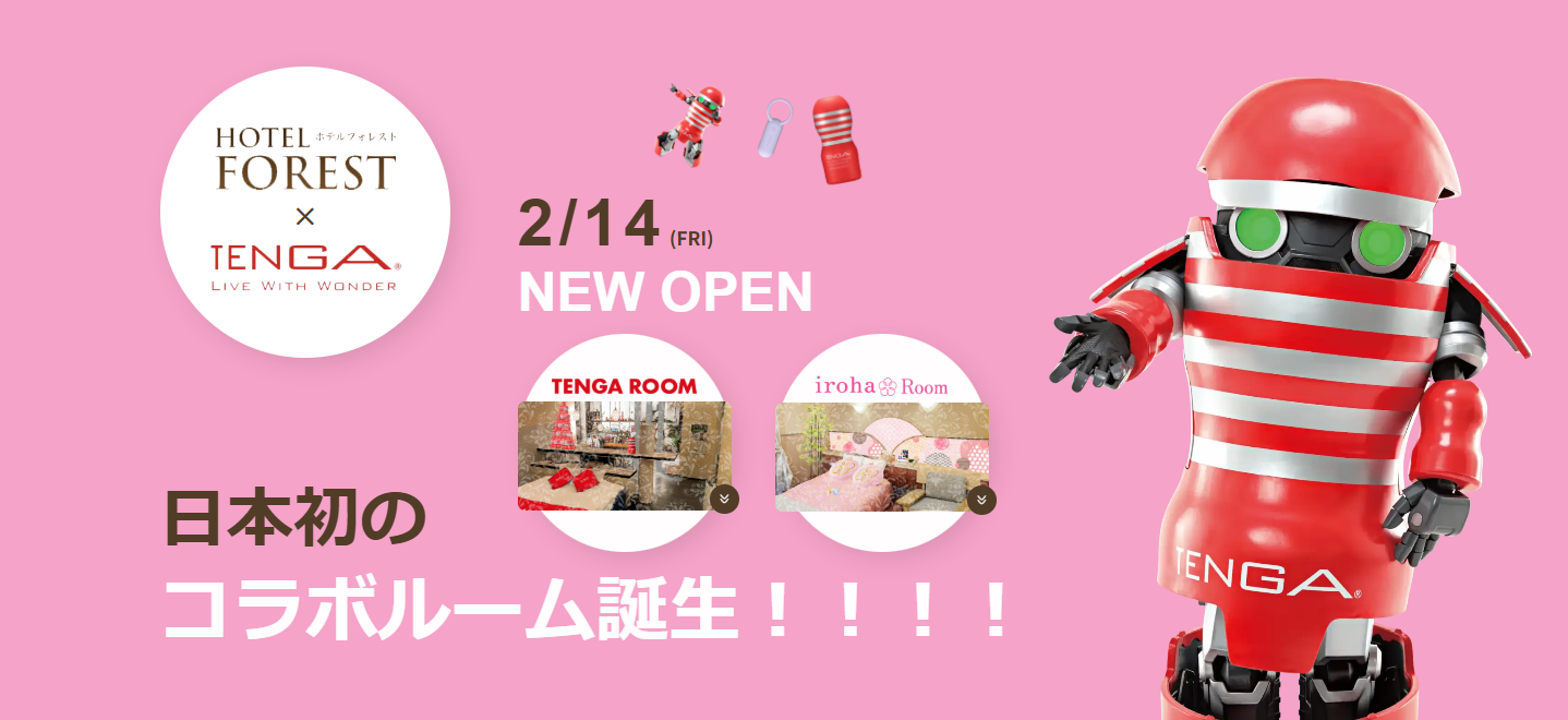 ホテルフォレストは、レジャーホテルを訪れるお客様に新鮮な喜びや驚きをお届けするため、株式会社TENGAとの協力によりコラボルームを実現しました。なお、ホテル内ではTENGA・irohaの一部アイテムを購入することも可能です。
