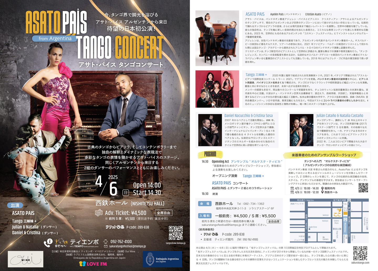 それに伴い、桜タンゴフェスティバル第10回開催記念特別プログラムとして、アルゼンチンからタンゴデュオ ASATO PAIS(アサト・パイス)を招へいし、4月 6日 (日)、 西鉄ホール(福岡市中央区天神2-11-3 ソラリアステージ゙6F)を会場に、「アサト・パイス タンゴコンサート」を開催する運びとなりました。