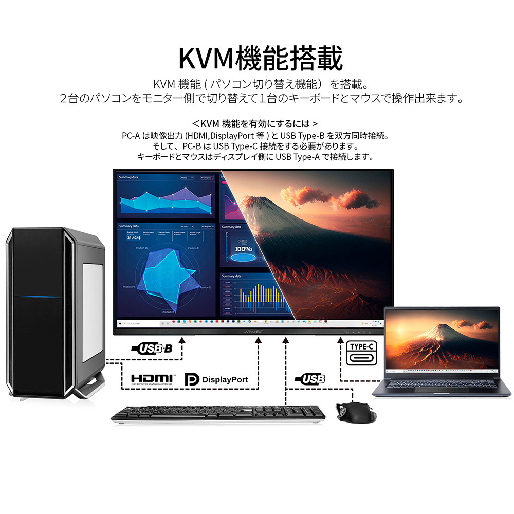 KVM機能に対応。モニターに接続したキーボード、マウスをデスクトップPCやUSB Type-C接続のノートPCで入力を切り替えた際にもそのまま使用可能です。