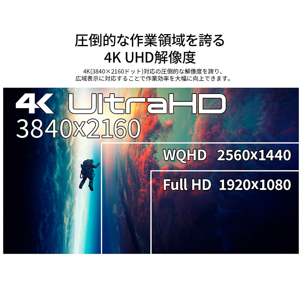 本製品は、28インチのIPSパネルを搭載し、4K(3840x2160)解像度に対応した液晶モニターです。フルHD(1920x1080)の4倍の高解像度は複数のウィンドウの同時表示を可能にし、圧倒的な高生産性を実現します。