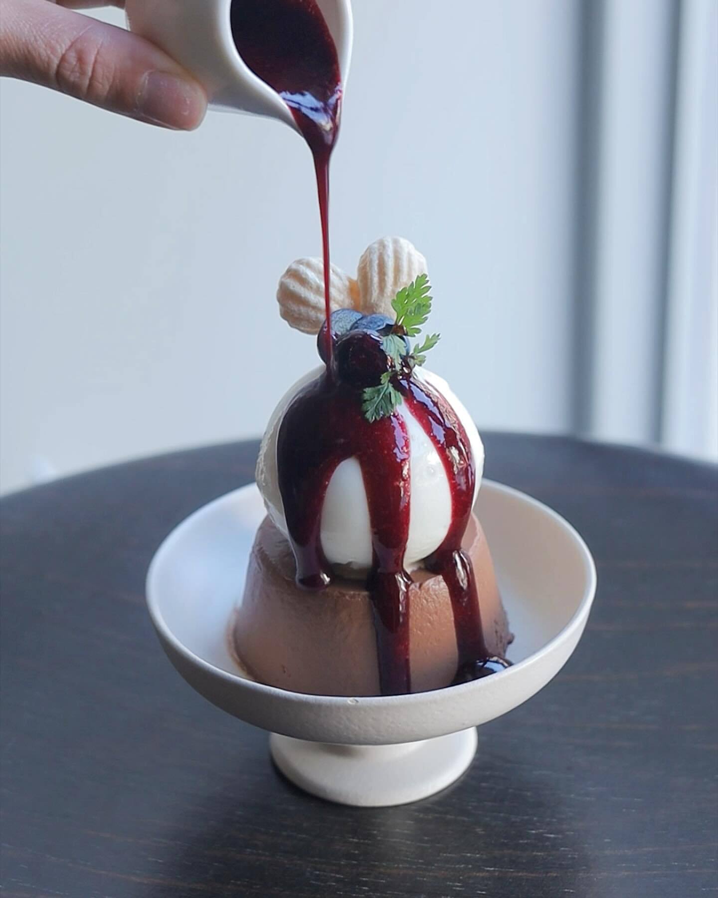 フランス産ダークチョコレートの風味が広がる濃厚なプリンに、なめらかなミルクアイスを添えました。酸味のあるカシスソースを合わせることで、奥行きのある味わいに仕上げています。トップにはジューシーなフレッシュブルーベリーと、サクッと軽い食感のハート型メレンゲクッキーをトッピング。濃厚さと爽やかさが絶妙に調和した、この時期ならではの大人のデザートをお楽しみください。