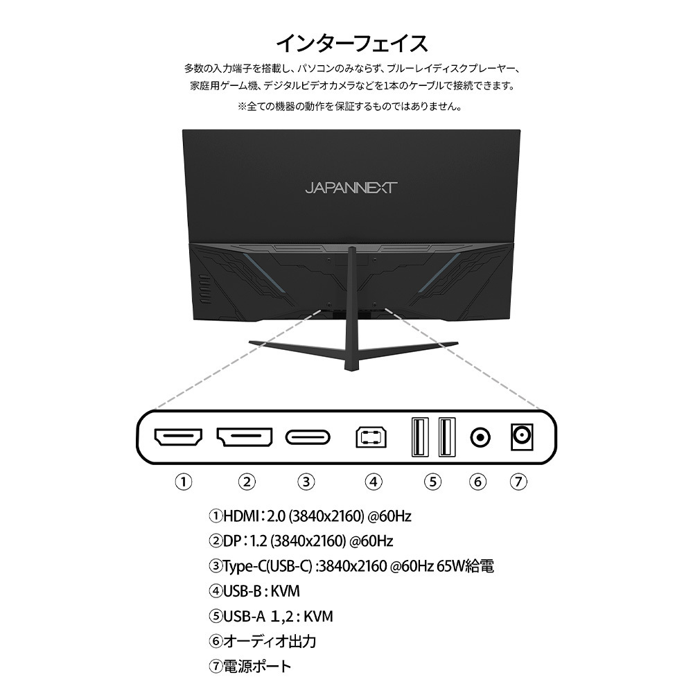 | 入出力端子 | HDMI 2.0 x1 (60Hz) DisplayPort 1.2 x1 (60Hz) USB Type-C x1 (60Hz/最大65W給電) オーディオ出力×1 |