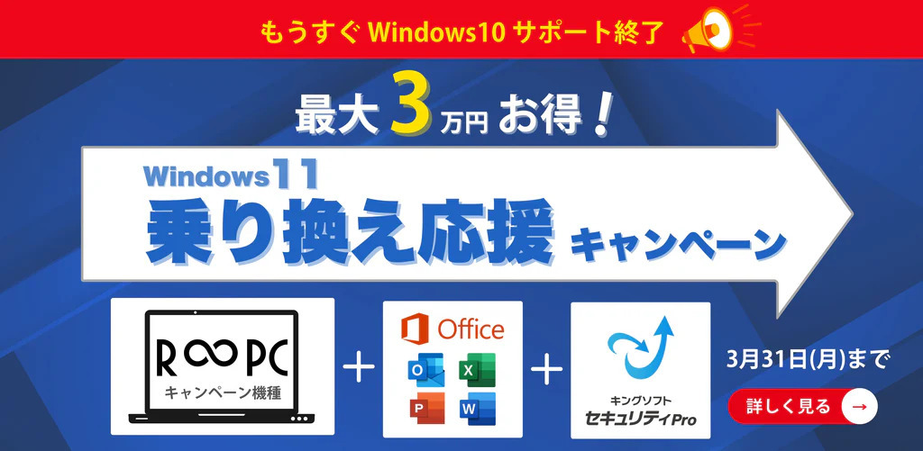 リユースPC事業を展開するリングロー株式会社(本社:東京都豊島区、代表取締役:碇敏之、以下「リングロー」)は、R∞PC(アールピーシー)公式ECサイト「R∞PCダイレクト」の3月のキャンペーンとしてR∞PCにオフィスソフト『Microsoft Office 2024 Home & Business』とセキュリティソフト『キングソフトセキュリティPro』を付属したキャンペーンセットを通常価格より最大3万円値引きでご提供します!10月のWindows10のサポート終了前に最新のWindows11搭載PCに乗り換える絶好のチャンスです!