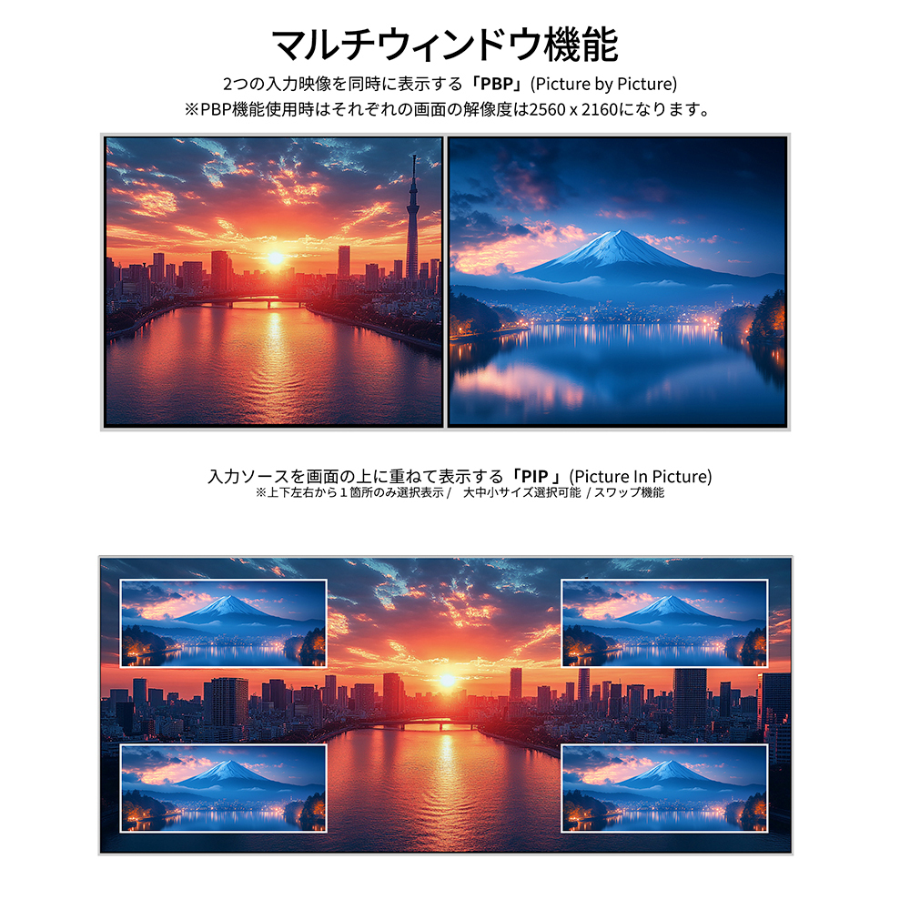 複数の入力を同時に表示する「PBP(Picture by Picture)」に対応、PBPモードでは、最大2つの入力映像を同時に表示可能。さらに入力の一つを子画面にて表示する「PIP(Picture in Picture)」も可能です。
