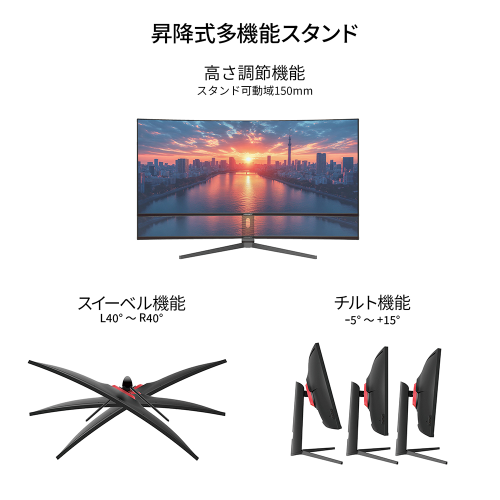 高さ調整が可能な昇降式多機能スタンドを搭載、最大150mmの範囲(横置時)で最適な高さに画面を調整可能です。また、スイーベル(首振り)機能は、左右各40°の範囲で動かせます。