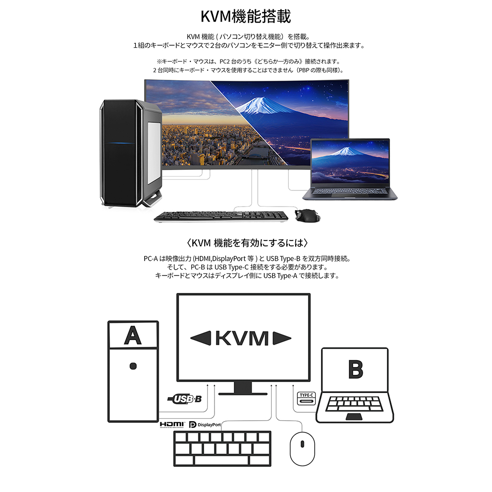 KVM機能は、モニターに接続したキーボード、マウスをデスクトップPCやUSB Type-C接続のノートPCで入力を切り替えた際にもそのまま使用可能です。